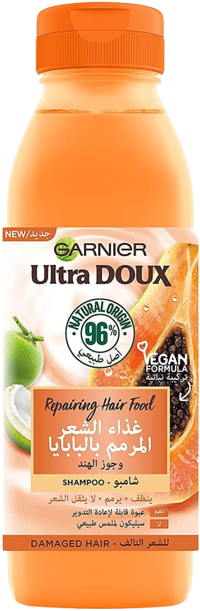 غارنييه الترا دو لتغذية الشعر، منتجنا الجديد لشعر متعطش للتغذية. تركيبة مكونة من 96% من مواد طبيعية و100% مكونات نباتية، يوفر لشعرك تغذية مذهلة بمستخلصات غذائية فائقة لشعر مذهل. شامبو تغذية الشعر بخلاصة البابايا وجوز الهند هو المزيج الطبيعي المثالي للشعر التالف.